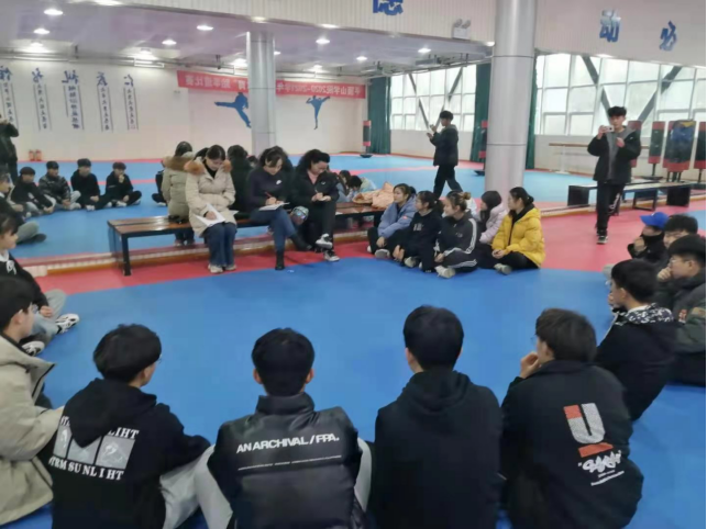 比赛结束后,三位老师在T105对参赛的员工代表召开了座谈会,听取了员工关于“线上线下混合式武术教学”学习感受。同学们纷纷表示,线上线下混合式武术教学,能够引导他们去获取知识,激发学习的自主性、积极性。在学习探索的过程中,还培养了他们的自主学习能力,团队合作精神和沟通能力,使同学们在互相帮助中共同提高运动技能。同学们还从员工的角度提出了混合式教学中应该改进的方向,为今后更好的进行武术教学改革,提高教学质量和效果提出了宝贵的建议。